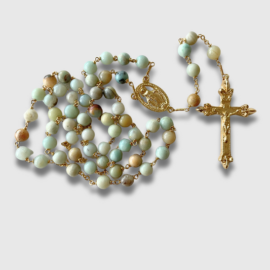 Rosario de piedra color verde claro con crucero medalla milagrosa, baño de oro 24 k