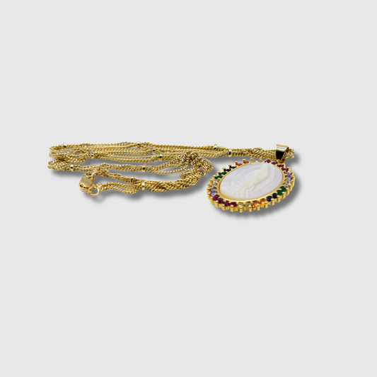 Medalla Virgen de Guadalupe de concha con aro piedras de colores.